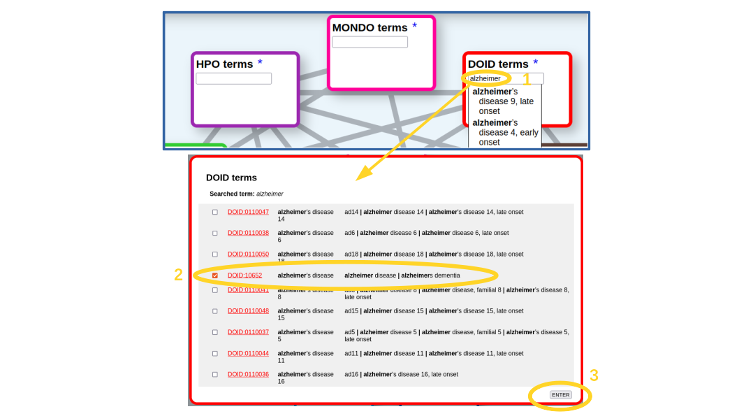 The first step is to look for our term(s) of interest in the corresponding ontology. In this case, we are going to look for the term corresponding to "alzheimer's disease" on the "disease ontology" (DOID). For that we start typing the term in the corresponding textbox (Figure 1). An autocompletion list shows up. It includes all terms with our typed characters in the name or any of the synonyms (what in this case are mainly variants of this disease). If our term of interest is on the list, we just select it, if not, we press [Enter] and a more detailed list of the matching terms pops up (Figure 1), which includes the terms' IDs (hyperlinked to the corresponding entries in the original resource to eventually retrieve more info), their names and synonyms. In this list we can select one or more terms (in case we want, for example, to retrieve relationships for more than one Alzheimer variants). In our case, we select only the main entry for the disease (DOID:10652), as we are not interested in an specific variant, and press the [Enter] button (Figure 1).