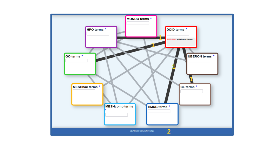 Once the term or terms of interest are in the corresponding box, we select the lines connecting it with all the other datasets for which we want to retrieve relationships. In our case, the lines connecting DOID with HPO (symptoms, clinical signs), GO (gene functions), HMDB (human-related metabolites) and CL (cell types) (Figure 2). Once the term(s) and the desired types of relationships are choosen, we press the [SEARCH COMENTIONS] button (Figure 2).