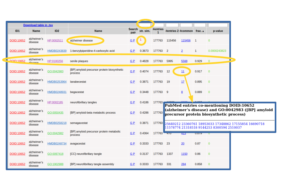 The final column shows the p-value of the hypergeometric test used for assessing the significance of the co-mention (see the publication above). Only pairs with p-value ≤ 0.001 are shown, and those with p-value ≤ 1·10-5 are highlighted in green color. The table can be sorted by any column by clicking the corresponding header. At the top left corner of the table there is a link to download the whole table in .TSV format so that it can be further processed, for example importing it into an external spreadsheet program. There are also text-boxes above the headers of the numerical columns to restrict the list of relationships according with certain values: less or equal (<=) the entered value for "str. sim.", >= for "#entries", >= for "frac" and <= for "p-value".