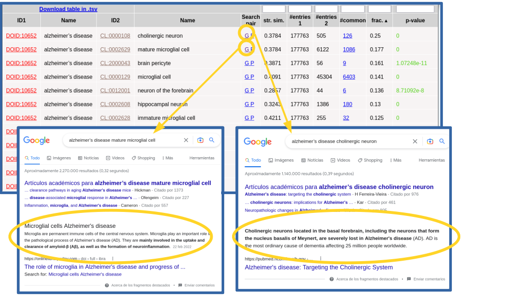 In this example, all the terms that show up in the list make sense considering what we intuitively known about this complex pathology and, together, they provide a comprehensive picture of its internal causes (molecular processes), external symptoms, cell types it affects, and related drugs and chemical compounds (Figure 3). Regarding clinical signs (HPO), we see the typical molecular/physiological manifestations related to senile plaques, neurofibrillary tangles, cortical atrophy, hirano bodies, etc, as well as its higher level mental and behavioral symptoms (apathy, delusions, dementia, memory problems, …). Within the biological processes terms (GO[BP]), we find those related to β-amyloid metabolism and neurofibrillary tangles, among others. Regarding molecular functions (GO[MF]), we can see those related to binding to amyloid-beta and tau protein, among others. Also the “cellular compartments” category of GO (GO[CC]) reflects what is known on this disease at the level of sub-cellular structures, with terms such as gamma-secretase complex, alpha-ketoglutarate dehydrogenase complex, lewy bodies, etc. Regarding the cell types (CL), we see the brain-related cell types associated to this disease, being the first ones "cholinergic neuron" (CL:0000108), known to be severely affected in this disease, and "mature microglial cell" (CL:0002629), which are involved in the uptake and clearance of β-amyloid. In Figure 4 we use the "G" link to perform Google searches for these cell type relationships in order to dig into their involvemetn in Alzheimer. For the chemical compounds (HMDB), the found relationships are mainly with drugs used for treating this disease, such as lanabecestat, begacestat, semagacestat, etc. If you want to inspect one of this categories in detail it is better to restrict the search for relationships to it in the previous step (Figure 2 above), as done for cell types (CL) in Figure 4.
